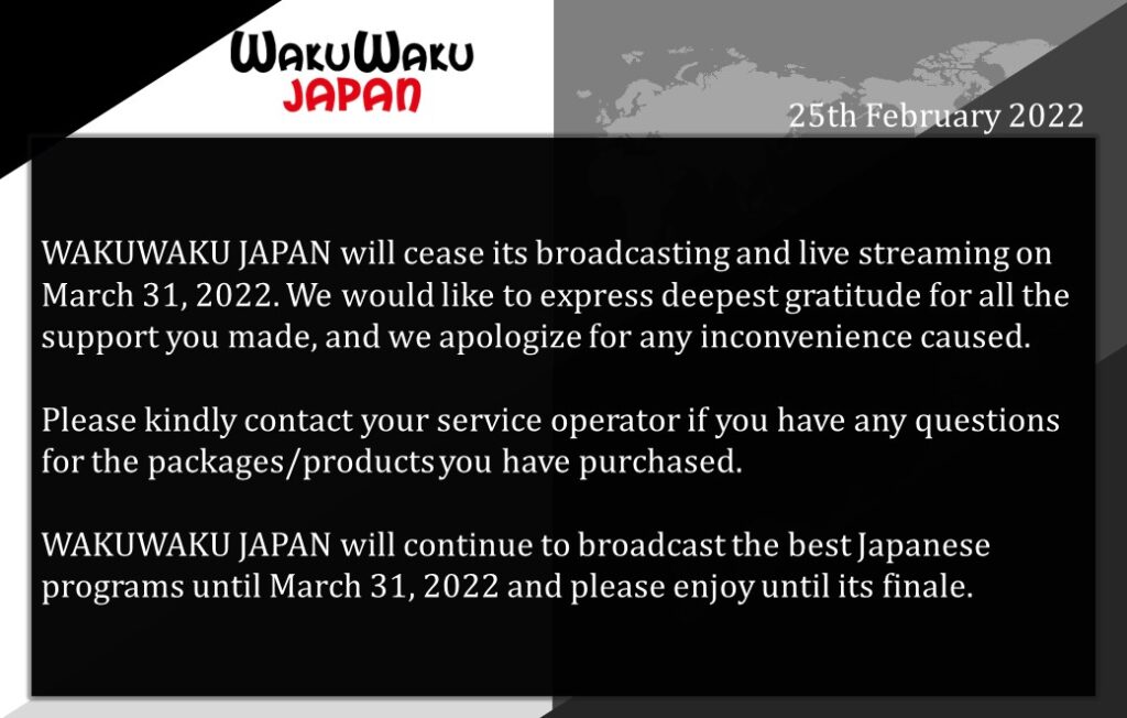 Trang Facebook chính thức của kênh WakuWaku Japan thuộc Tập đoàn SKY Perfect JSAT Corporation đã thông báo rằng kênh này sẽ ngừng phát sóng và phát trực tuyến nội dung vào ngày 31 tháng 3.