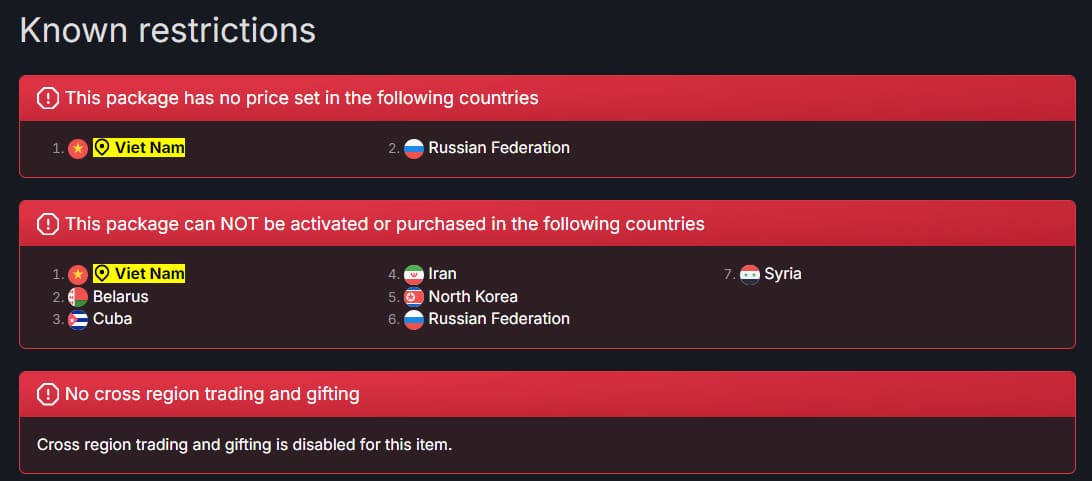 Dựa theo thông số trên SteamDB, hơn 100 quốc gia mà trước đó không thể mua tựa game giờ đây đã có thể thoải mái mua và trải nghiệm trò chơi. Tuy nhiên, lệnh cấm vẫn còn tồn tại cho 7 quốc gia – trong đó bao gồm cả Việt Nam.