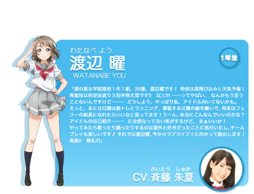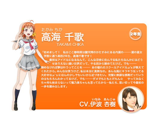 Anju Inami trong vai Chika Takami: là em út trong 3 chị em, fan của μ’s, và là Leader trong nhóm Idol của mình. Gia đình của cô bé mở một nhà trọ, nổi tiếng với hồ tắm lộ thiên nhìn ra biển được. một nữ sinh kawaii lớp 11.