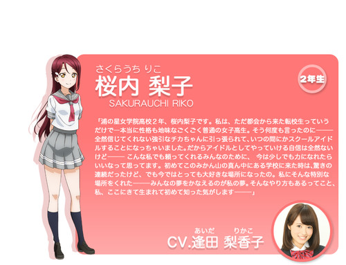 Rikako Aida trong vai Riko Sakurauchi: nữ lớp 11, sống ở Akihabara, Tokyo. Nhưng chuyển trường đến Uchiura. Riko sống giản dị, trầm lặng. Có năng khiếu vẽ và thích ở trong nhà. Cô bé trở thành school idol vì bị Chika “dụ dỗ”.