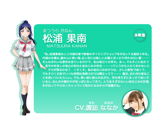 Nanaka Suwa trong vai Kanna Matsuura: nữ sinh lớp 12 sống và làm việc với ông của mình ở một cửa hàng lặn ở một hòn đảo gần đấy. Cô bé là bạn thời thơ ấu của Chika và trờ thành school idol để giúp Chika hoàn thành kế hoạch của mình.