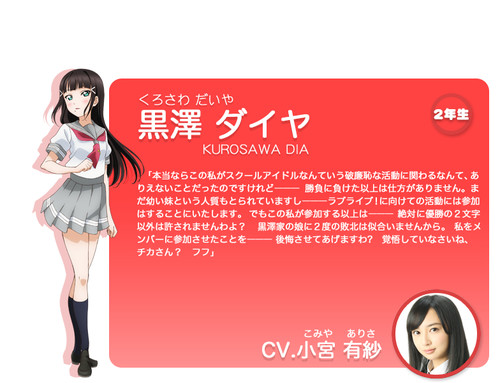 Arisa Komiya trong vai Dia Kurosawa: nữ sinh lớp 11 đến từ một gia đình danh giá trong vùng. Cô bé trở thành hội trưởng hội học sinh như thể đó là điều đương nhiên vậy. Rất kiêu hãnh và điềm tĩnh. Trong hồ sơ của mình, Dia có nói rằng Chika sẽ phải hối hận vì đã cho cô bé gia nhập nhóm vì Dia không phải là người chấp nhận thất bại. Từ Dia có nghĩa là kim cương trong tiếng Nhật.