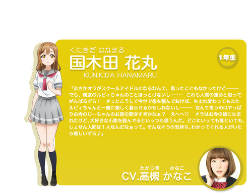 Kanako Takatsuki trong vai Hanamaru Kunikida, nữ sinh lớp 10 và là con gái của một gia đình trông coi đền thờ qua bao đời. Hát rất hay và là thành viên của đội hợp xướng địa phương. Thích đọc sách và rất dễ bị chóng mặt.