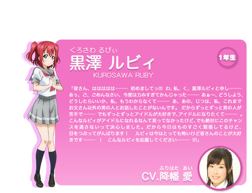 Ai Furihata trong vai Ruby Kurosawa: nữ sinh lớp 10, hay khóc nhè, và rất sợ con trai. Có điểm mạnh duy nhất là biết may vá.
