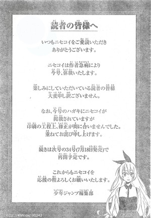 Họ cũng trấn an độc giả rằng Nisekoi sẽ trở lại trong số 34 của tạp chí, phát hành ngày 18 tháng 7.