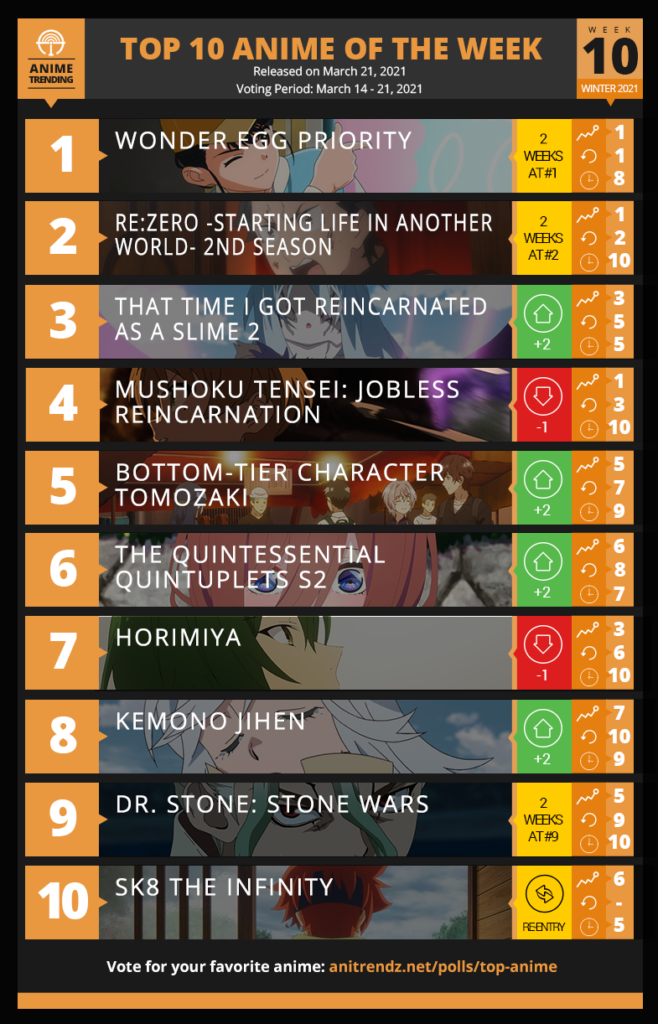 Anime Trending vừa qua đã công bố bảng xếp hạng anime mùa đông 2021 tuần 10 (tính từ ngày 14 tháng 3 – 21 tháng 3 năm 2021). Tuần này, tấm chiếu mới Wonder Egg Priority tiếp tục giữ vững phong độ khi đứng vị trí #1. Với tuần thứ 2 liên tục đứng ở vị trí cao nhất này, Wonder Egg Priority đã có 2 tuần đứng đầu bảng xếp hạng. Vị trí #2 thuộc về Re:Zero Season 2 và #3 thuộc về That Time I Got Reincarnated as a Slime season 2.