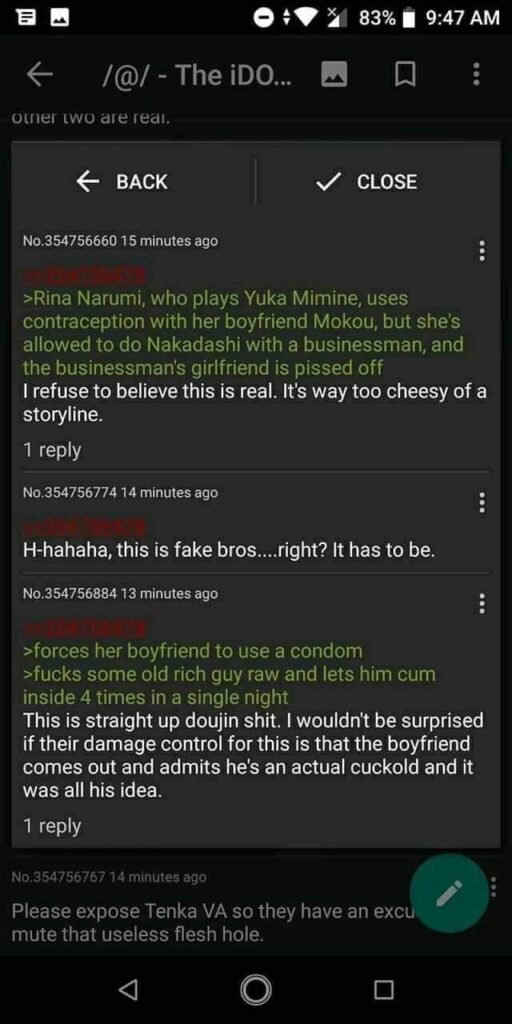 Các đoạn tin nhắn này sau đó được lan truyền trên Twitter, các trang blog ở Nhật Bản, cũng như các trang như reddit, 4chan, 2chan… Một số thông tin nhạy cảm hơn còn được tiết lộ như việc Narumi bắt bạn trai quan hệ tình dục an toàn nhưng với người đàn ông kia thì không. Các meme chế nhạo Narumi cũng đã bắt đầu xuất hiện.