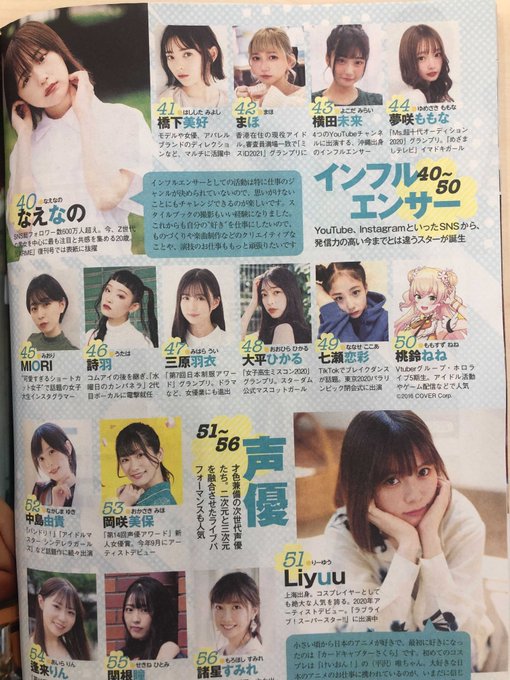Số phát hành được xuất bản tại Nhật Bản vào thứ Hai. Danh sách “Thế hệ phụ nữ xinh đẹp kế tiếp” kỷ niệm 55 năm thành lập tạp chí bằng cách giới thiệu 56 phụ nữ dự kiến sẽ gây chú ý trong tương lai gần, khi ấn phẩm bước sang năm thứ 56. Danh sách này bao gồm người mẫu, nữ diễn viên lồng tiếng, diễn viên, thần tượng và những người có ảnh hưởng trực tuyến.