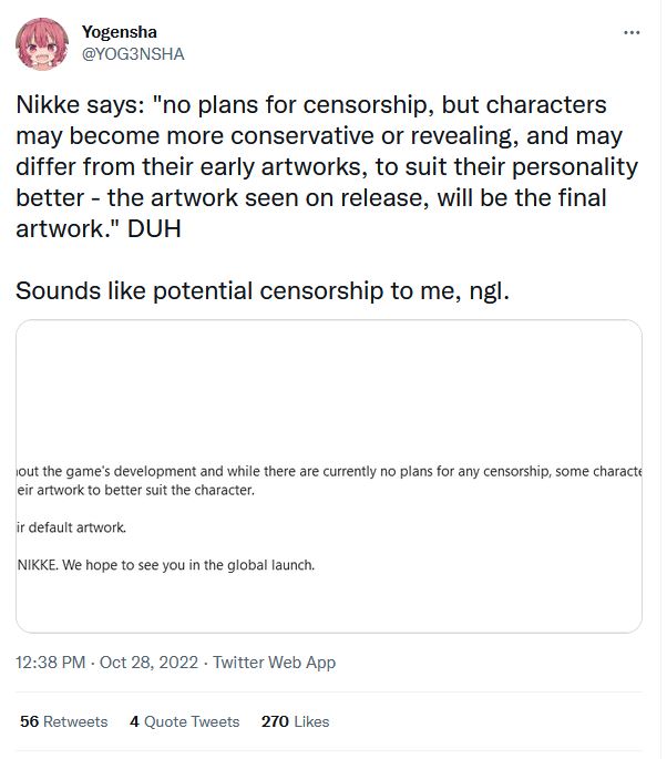 Như vậy so với phiên bản gốc, GODDESS OF VICTORY: NIKKE bản toàn cầu sẽ có đôi chút chỉnh sửa về trang phục nhân vật. Có lẽ Level Infinite cũng hiểu sẽ cực kỳ rắc rối nếu như những “nhà nhân quyền online” ở Phương Tây nhòm ngó và lên tiếng chỉ trích game.