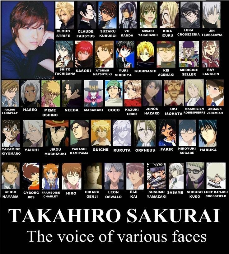 Takahiro Sakurai là một trong những nam diễn viên lồng tiếng hàng đầu Nhật Bản. Anh được biết đến qua các vai như Griffith trong Berserk, Giyū Tomioka trong Demon Slayer: Kimetsu no Yaiba, Suzaku trong Code Geass, Ayame trong Fruits Basket, Rohan trong JoJo’s Bizarre Adventure: Diamond Is Unbreakable, Reigen trong Mob Psycho 100, Sasori trong Naruto Shippūden, Francis F. trong Bungo Stray Dogs, Izumo Kusanagi trong K, và Cloud trong Final Fantasy VII.