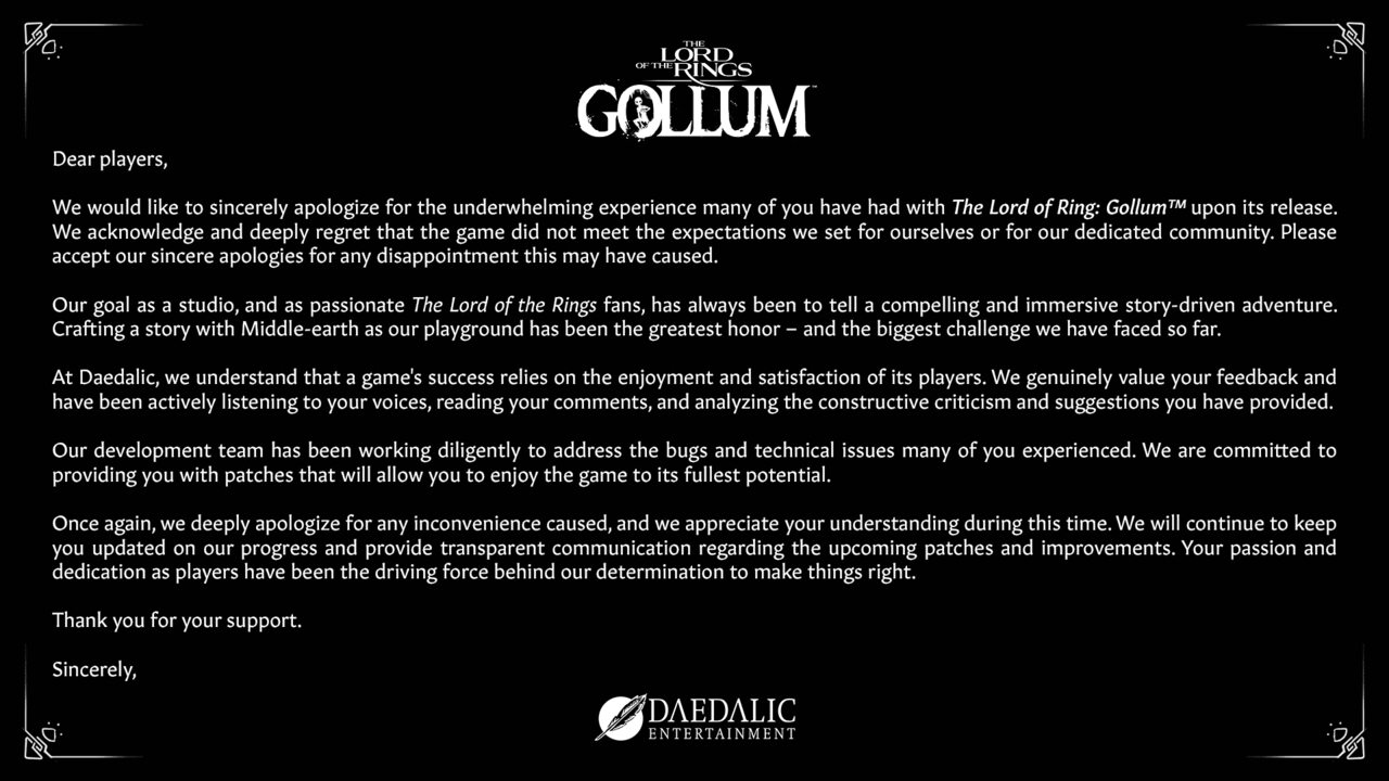 Ở gần cuối bài viết, Daedalic cho biết hãng đang cố gắng cải thiện The Lord of the Rings: Gollum bằng cách “vá” những lỗi quan trọng trong các bản cập nhật sắp tới.