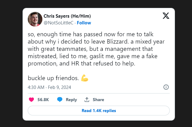 Trong một bài đăng tương đối dài trên Twitter, Chris Sayers – một vị Họa sĩ Kỹ xảo (VFX Artist) – chia sẻ rằng Blizzard đã nói dối và ngược đãi anh ta khi Overwatch 2 còn đang trong giai đoạn phát triển.