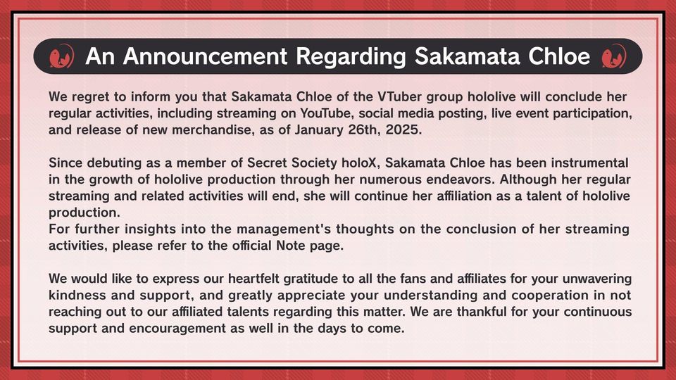 “Chúng tôi rất tiếc phải thông báo rằng Sakamata Chloe của nhóm VTuber Hololive sẽ kết thúc các hoạt động thường xuyên của mình, bao gồm phát trực tiếp trên YouTube, đăng bài trên mạng xã hội, tham gia sự kiện trực tiếp và phát hành sản phẩm mới, kể từ ngày 26 tháng 1 năm 2025.