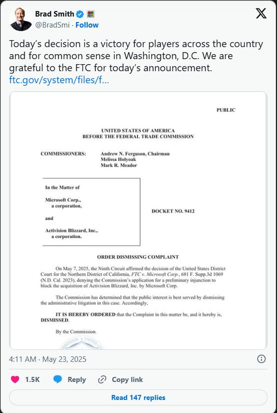 Chủ tịch Microsoft, Brad Smith, đã gọi quyết định của FTC là “một chiến thắng cho game thủ trên toàn quốc và cho sự hợp lý trong chính sách công”. Ông cũng bày tỏ lòng biết ơn đối với FTC vì đã kết thúc vụ kiện kéo dài này.