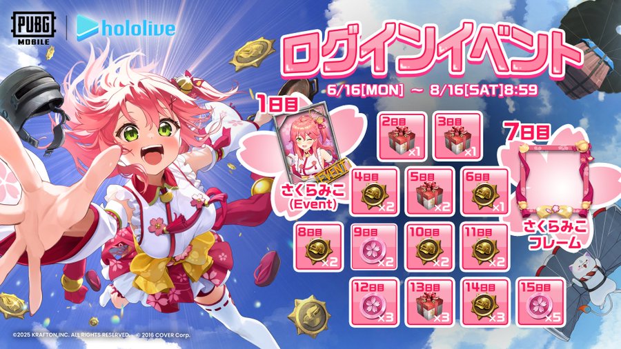 Song song với sự kiện chính là chuỗi phần thưởng đăng nhập dành riêng cho lần hợp tác này. Người chơi chỉ cần đăng nhập mỗi ngày sẽ có cơ hội nhận các phần quà như phiên bản Sakura Miko (sự kiện) và khung hình Sakura Miko.