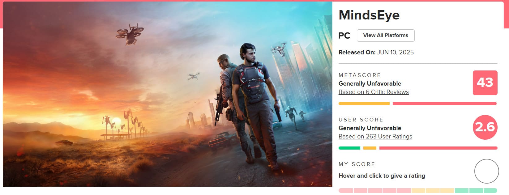 Kể từ khi ra mắt vào ngày 10/06, MindsEye đã nhận được nhiều chỉ trích từ phía cộng đồng game thủ do có nhiều lỗi cũng như thiết kế tệ sẵn.