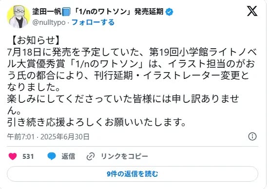 Ngay sau đó, một light novel mang tên “One Watson in a Million” dự kiến phát hành ngày 18/7 tại Nhật Bản, do Gaou minh họa cũng gặp sự cố vì drama này. Tác giả Nuruta Ippo của light novel thông báo trên Twitter: “Việc phát hành ‘One Watson in a Million,’ tác phẩm đạt giải Xuất sắc tại Cuộc thi Shogakukan Light Novel Grand Prix lần thứ 19, sẽ bị hoãn do những vấn đề liên quan đến họa sĩ Gaou. Chúng tôi dự kiến sẽ thay đổi họa sĩ thiết kế và hoãn ngày phát hành. Xin lỗi những ai đã mong chờ tác phẩm này và cảm ơn sự thông cảm của mọi người.”