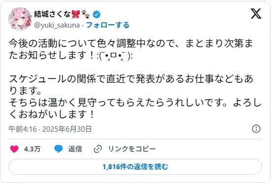 Yuki Sakuna, nữ VTuber nổi tiếng được Gaou thiết kế avatar cũng như một số hình minh họa khác, đã đăng tweet: “Tôi đang sắp xếp một số việc liên quan đến hoạt động tương lai, nên sẽ sớm thông báo khi mọi thứ được ổn thỏa! :(˘•̥ㅁ•̥˘ ). Vì lịch trình, một số dự án cũng sẽ sớm được công bố. Mong mọi người theo dõi và ủng hộ tôi nhé!”