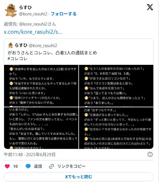 Ngày 30/6, một streamer nổi tiếng và cũng đầy tranh cãi ở Nhật Bản tên KoreKore đã gây bão trong ngành giải trí nước này qua một buổi phát trực tiếp, trong đó anh ta cáo buộc họa sĩ minh họa Gaou là một người đàn ông đã ngoài 40 tuổi, có quan hệ tình cảm với một cô gái vị thành niên.