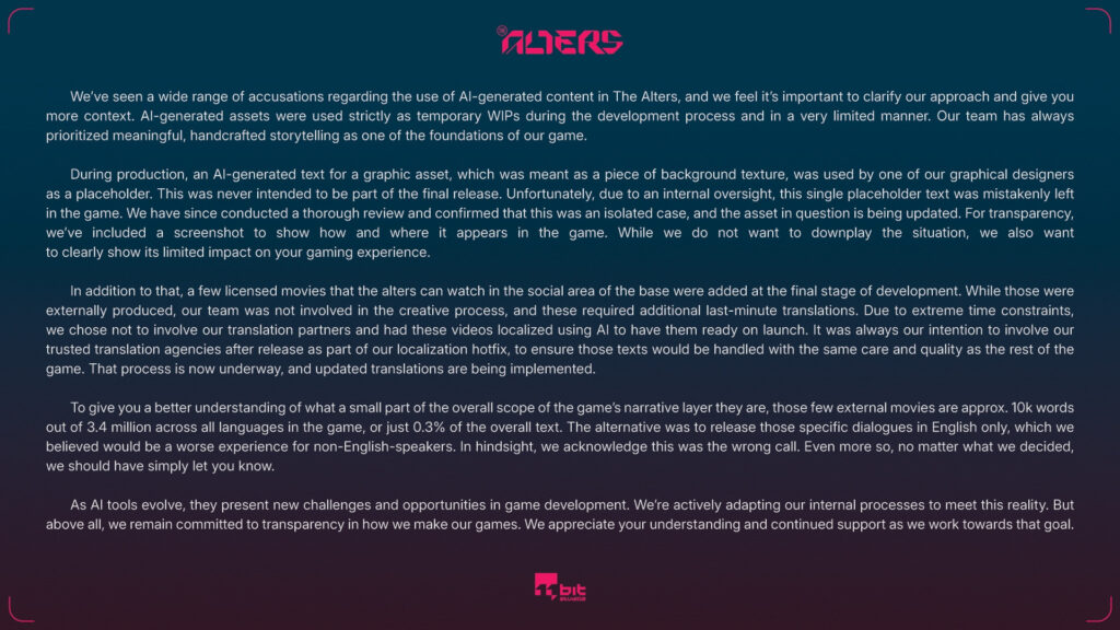 11 Bit Studios tiếp tục chia sẻ: xuyên suốt quá trình phát triển của The Alters, một “dòng chữ do AI tạo ra cho một nội dung hình ảnh” đã được một nhà thiết kế sử dụng làm “nội dung tạm thời” (Placeholder). Sau đó, nội dung này đã vô tình bị bỏ sót trong phiên bản cuối cùng của tựa game.