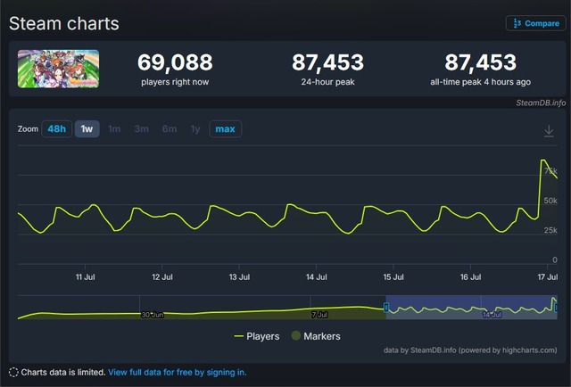 Ngày 16/7/2025, Cygames đã tung ra thẻ SSR hỗ trợ “Kitasan Black”, khiến lượng người chơi gần như tăng gấp đôi trong đêm, lập mức đỉnh mới 87.453 người (từ ~50.000). Thẻ này được đánh giá là cực kỳ mạnh, gia tăng tần suất kích hoạt hint, boost tốc độ và hỗ trợ nhân vật trong quá trình huấn luyện.