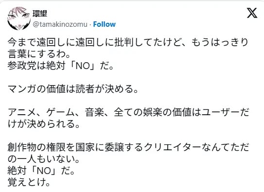Người khác bình luận: “Chỉ có người tiêu dùng mới có quyền quyết định giá trị của anime, game hay âm nhạc. Không có nhà sáng tạo nào muốn giao quyền kiểm soát cho nhà nước cả.”