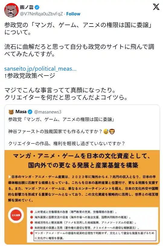 Nhằm hỗ trợ ngành công nghiệp này, Sanseito đề xuất nhiều chính sách tương tự chiến lược “Cool Japan” hiện hành của chính phủ, như đầu tư phát triển nhân lực, cải thiện điều kiện làm việc cho giới sáng tạo, và hỗ trợ doanh nghiệp mở rộng ra nước ngoài.