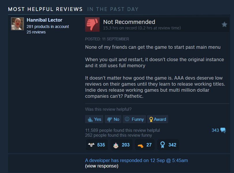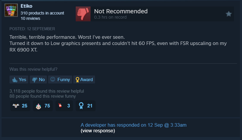 Một người chơi khác đã để lại một bài đánh giá vô cùng ngắn, nhưng vẫn có thể thu hút được sự chú ý của hơn 4.000 người. Bài đánh giá cho biết kể cả khi chạy ở mức đồ họa thấp và sử dụng công nghệ FSR, anh ta vẫn không thể đạt được 60 FPS với card đồ họa RX 6900 XT.