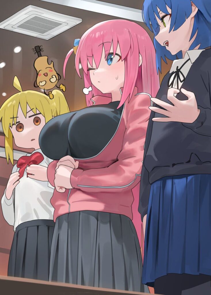 + Những cảnh các nhân vật nữ bình luận về kích thước Vòng 1 cũng bị cắt bỏ (và rõ ràng là kích thước Vòng 1 của Bocchi cũng bị giảm đi so với manga).