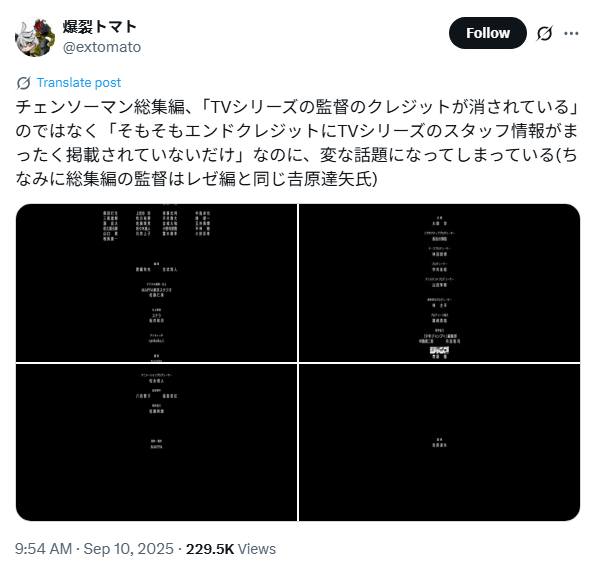 Studio MAPPA lại tiếp tục vướng vào tranh cãi mới. Một bộ phim tổng hợp của Chainsaw Man, hiện đang chiếu tại Nhật, được phát hành nhằm tóm tắt lại nội dung mùa đầu tiên của anime, đã gây chú ý khi khán giả phát hiện đạo diễn Ryū Nakayama bị gỡ tên khỏi phần credit.