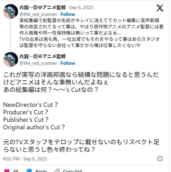 Koga viết trên Twitter rằng ngoài việc có thêm một số cảnh mới và lồng tiếng lại, tên của Nakayama hoàn toàn biến mất: “Điều này cho thấy đạo diễn anime không có chút quyền lợi nào về đạo đức hay uy tín. Một studio không biết bảo vệ đạo diễn của mình thì không thể tin tưởng được.”