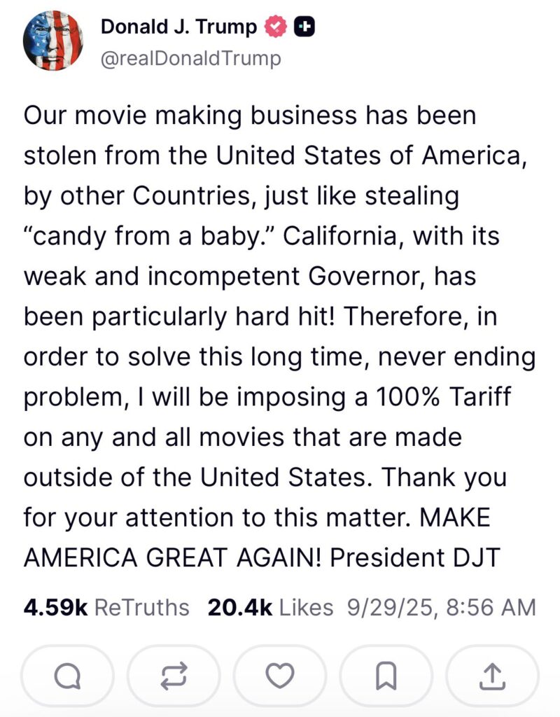Tổng thống Mỹ Donald Trump tuyên bố ông sẽ áp dụng mức thuế 100% đối với “bất kỳ và tất cả các bộ phim được sản xuất bên ngoài Hoa Kỳ”.