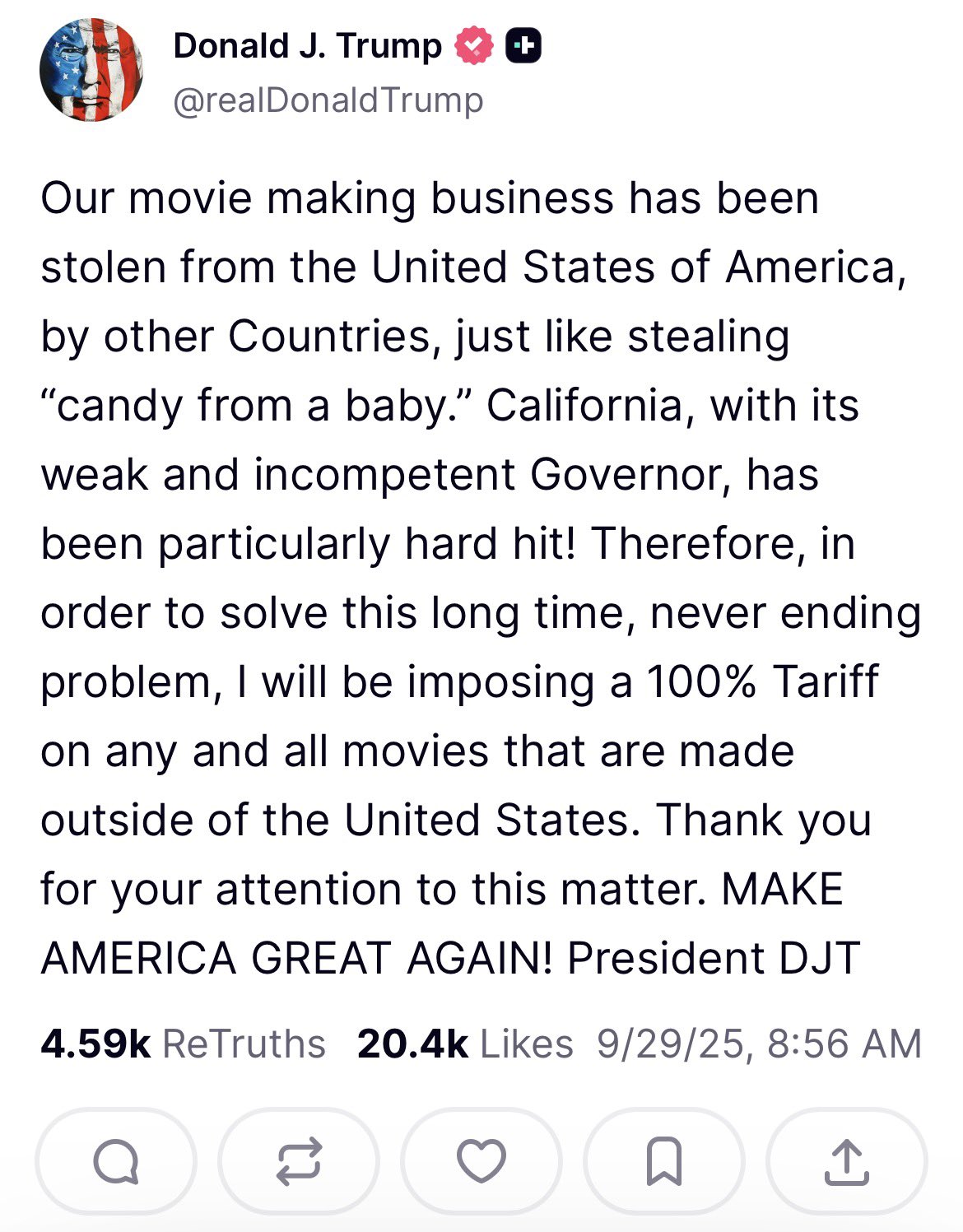 Ông cho biết trên mạng xã hội Truth Social: “Ngành sản xuất phim của chúng ta đã bị đánh cắp khỏi Hoa Kỳ bởi các quốc gia khác, giống như việc đánh cắp ‘kẹo từ trẻ em’ vậy.”