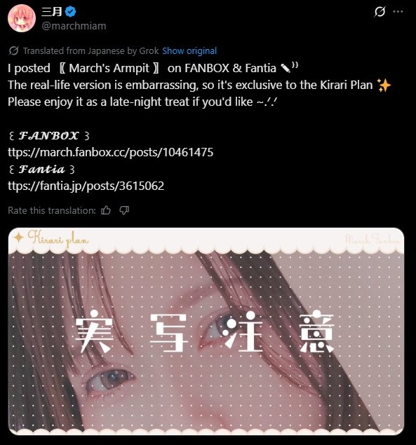 Nữ tác giả Mitsuki dường như muốn tạo sự bất ngờ cho người hâm mộ, nên cô đã bắt đầu đăng ảnh khỏa thân của chính mình lên cùng tài khoản Fanbox đó. Trước đây người ta đã từng bàn tán, nhưng chưa ai xác nhận — còn bây giờ, có người đã truy cập được Fanbox của cô và xác nhận là thật, thậm chí thấy cả ảnh.