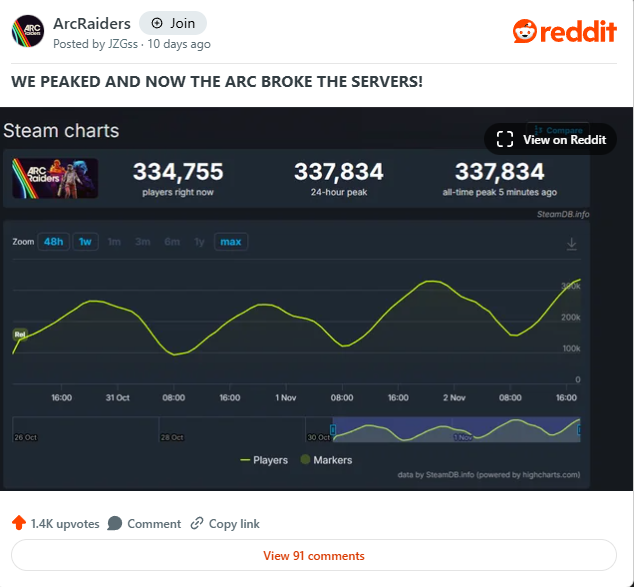 Việc ARC Raiders đạt được kỷ lục người chơi mới cũng như việc bị sập máy chủ cho thấy sản phẩm là một thành công rực rỡ, điều này còn cho thấy tựa game sẽ là một đối thủ xứng tầm với Escape from Tarkov trong lĩnh vực “extraction shooter” (game bắn súng lượm đồ).