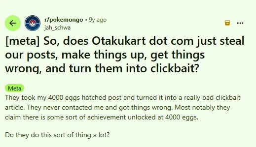 Ảnh chụp màn hình ở trên là từ bài Reddit đó, nơi một người dùng nói rằng Otakukart sao chép bài của họ và thêm hàng loạt thông tin bịa đặt. Điều đáng chú ý hơn cả: bài Reddit đó đã có từ 9 năm trước, nhưng khi bạn truy cập bài viết bị tố cáo, nó lại hiển thị ngày đăng là 26 tháng 4 năm nay!