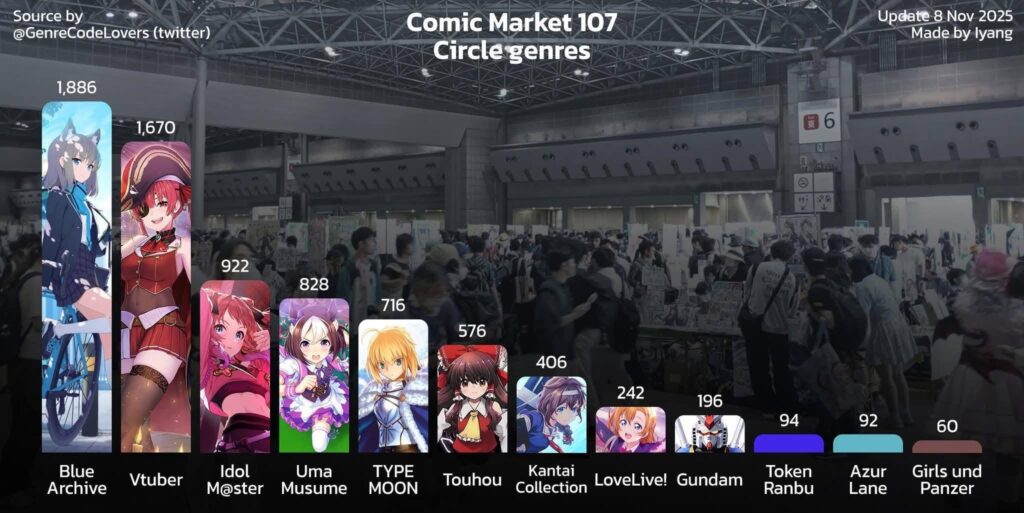 Thế nhưng số lượng circle doujin của Comiket năm nay thật sự gây sốc. Blue Archive liên tục tăng trưởng kể từ khi ra mắt năm 2021, và hiện đang có 1.886 circle đăng ký bán doujinshi. Dù con số này từng đạt đỉnh 2.290 vào hai kỳ trước, nó vẫn cho thấy sức hút quá mạnh. Để so sánh: tất cả các game gacha khác cộng lại chỉ có 1.550 circle, và VTuber có 1.670 circle.