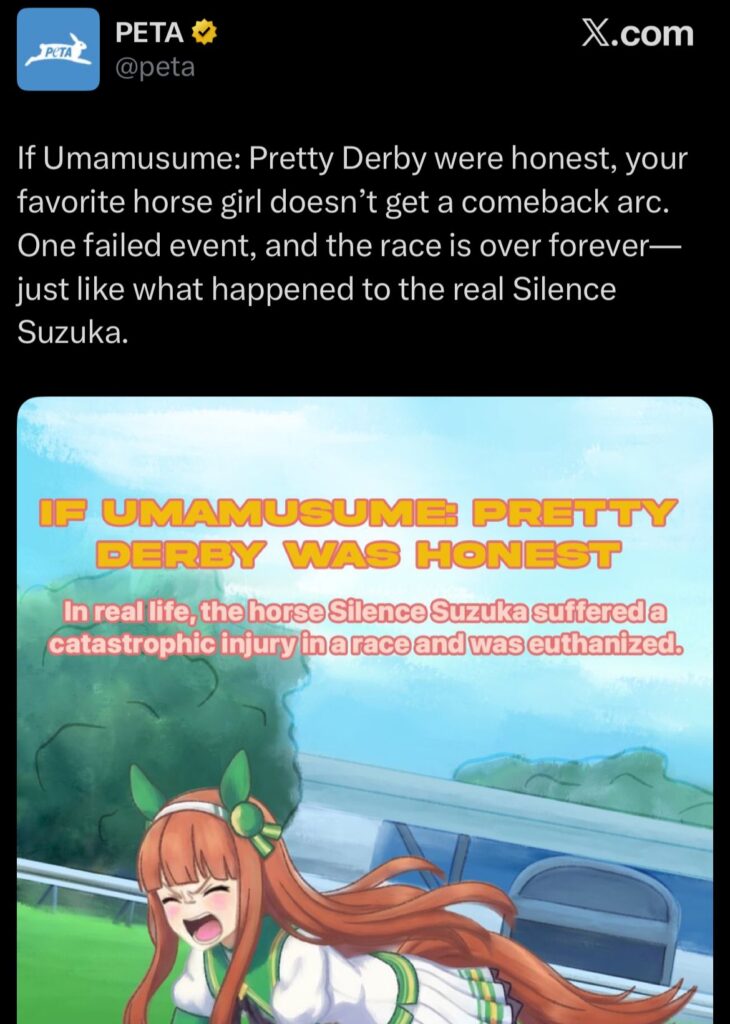 Bài đăng có tiêu đề kiểu “Nếu Umamusume: Pretty Derby thành thật”, đi kèm một hình minh họa do PETA tự dựng, mô tả Silence Suzuka – một “cô ngựa” nổi tiếng – nằm đau đớn trên mặt đất với chấn thương nghiêm trọng.