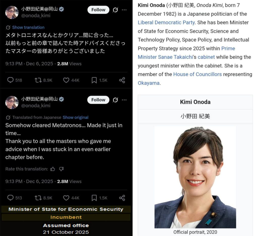 Kimi Onoda, một chính trị gia thuộc Đảng Dân chủ Tự do (LDP) của Nhật Bản, người trở thành tâm điểm chú ý vào năm 2025 sau khi được bổ nhiệm vào nhiều vị trí quan trọng trong Chính phủ của Thủ tướng Sanae Takaichi, gần đây đã đăng tải một lời kêu gọi mạnh mẽ gửi tới người dùng X và các trang tin trực tuyến. Sau một bài đăng tưởng chừng vô hại khi cô nói mình đang chơi tựa game mobile nổi tiếng Fate/Grand Order, Onoda đã viết một bài dài yêu cầu mọi người ngừng việc gán ghép sở thích chơi game và anime của cô với lập trường chính trị.