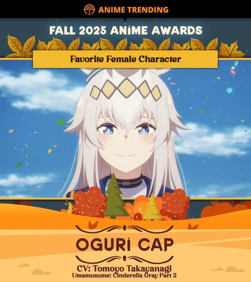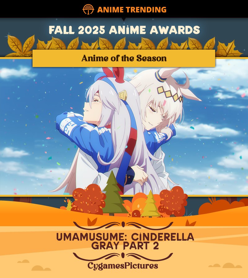 Trang Anime Trending đã công bố kết quả chung cuộc của Giải thưởng Anime Mùa Thu 2025. Uma Musume: Cinderella Gray gần như “chiếm trọn” toàn bộ giải thưởng lần này với danh hiệu Anime của Mùa, Nhân vật nữ chính được yêu thích, Nhân vật nữ phụ được yêu thích nhất, Ca khúc OP được yêu thích nhất và Anime thể loại Drama Ấn tượng nhất.