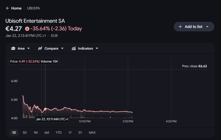 Sau khi công bố thực hiện một đợt tái cấu trúc lớn, cổ phiếu của Ubisoft đã giảm đáng kể ở mức hơn 30%.