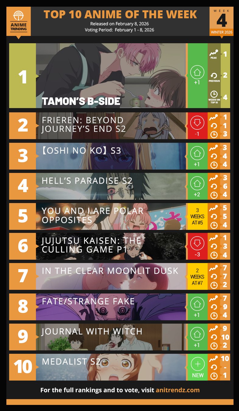 Trang Anime Trending đã công bố bảng xếp hạng anime mùa đông 2026 ở tuần 4. Tamon’s B-Side bất ngờ vượt qua Sousou no Frieren để chiếm lấy ngôi đầu, trong khi Oshi no Ko và Hell’s Paradise đang bám sát ngay phía sau, sẵn sàng lật đổ hai bộ anime đình đám này.