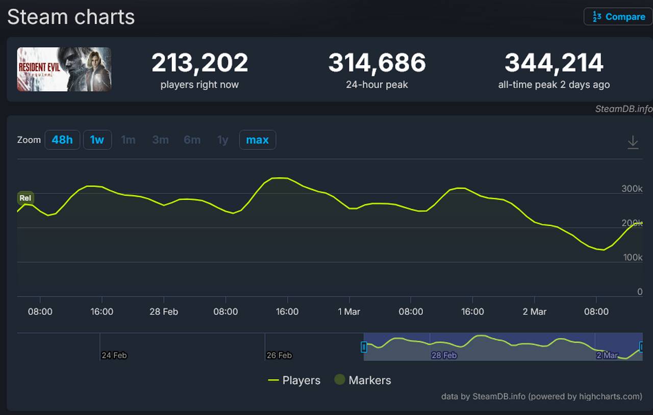 Resident Evil: Requiem đã lập kỷ lục mới cho cả dòng game khi đạt 334.214 người chơi đồng thời trên Steam trong cuối tuần ra mắt. Con số này gần gấp đôi kỷ lục trước đó của Resident Evil 4 Remake (168.191 người) và vượt xa các phần khác như Resident Evil Village (~106.631 người).
