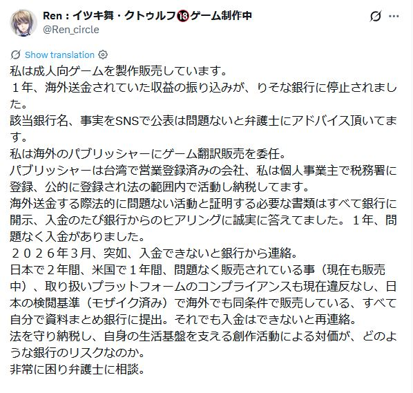 Nhà phát triển này trước đó kiếm tiền từ các nguồn doanh thu quốc tế—chẳng hạn như các nền tảng như Steam—nhưng sau đó phát hiện các khoản chuyển tiền vào tài khoản ngân hàng tại Nhật của họ đột ngột bị dừng lại. Ngay cả sau khi xác nhận rằng hoạt động kinh doanh của mình là hợp pháp và tuân thủ quy định, ngân hàng vẫn bị cho là từ chối xử lý các khoản tiền, chỉ viện dẫn những “rủi ro” không xác định mà không giải thích thêm.